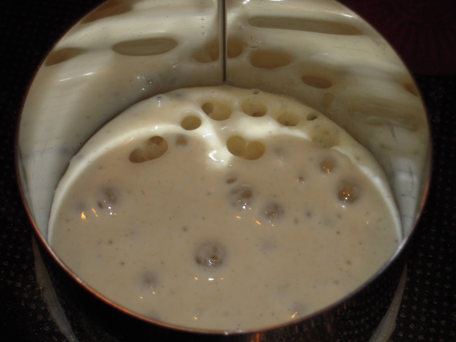 On beurre une poêle qu’on met sur feu doux et dessus, on pose des cercles à pâtisserie, eux mêmes beurrés. A l’intérieur de chaque cercle, on met à peut près 1 à 2 cm de pâte.