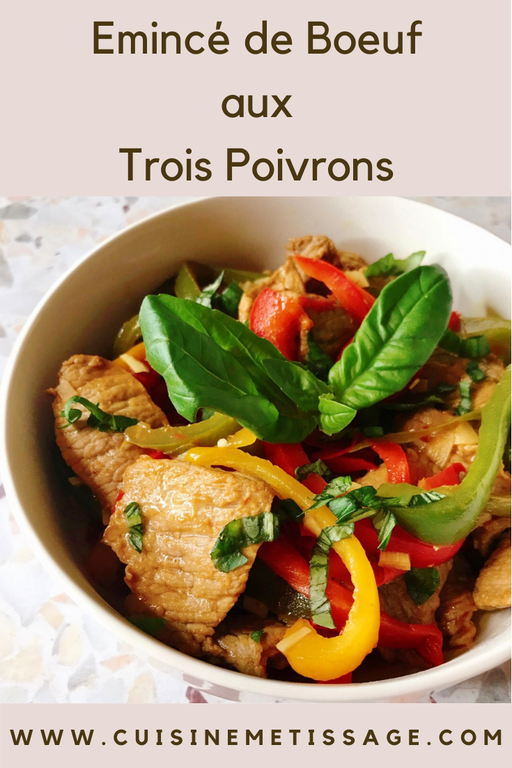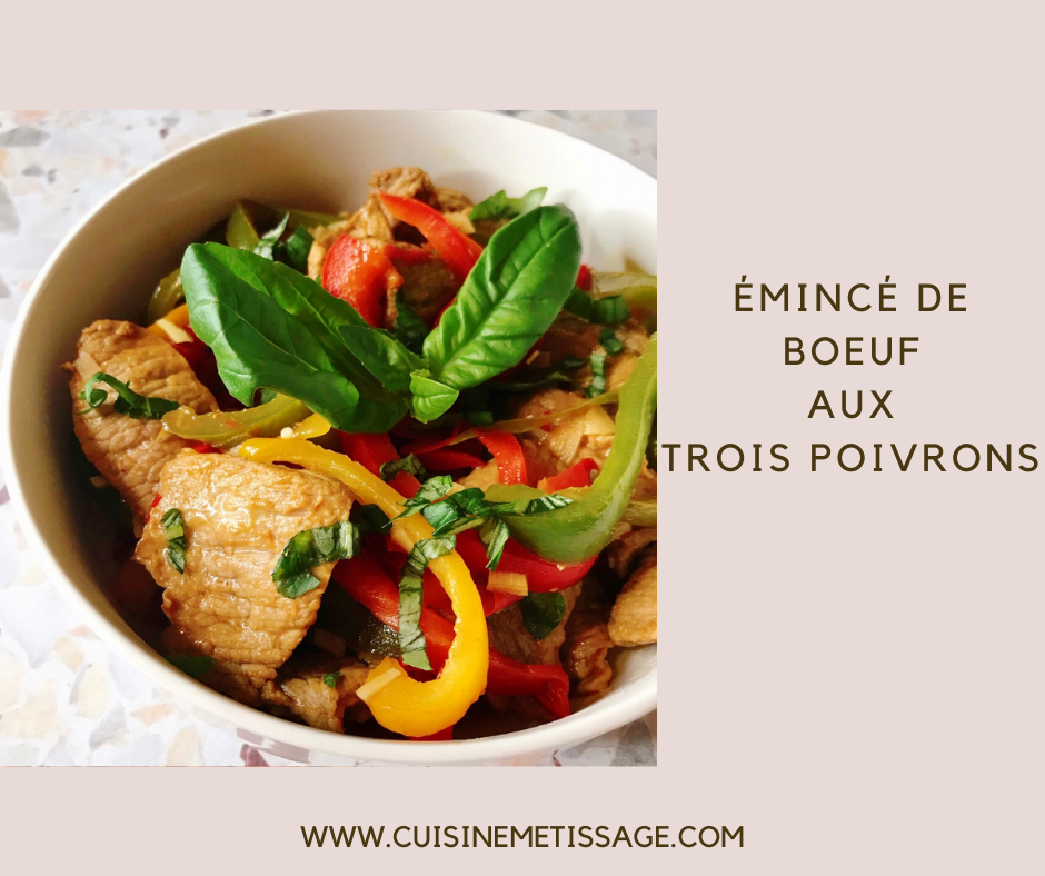 Dans un wok, je fais revenir à feu vif les poivrons pendant 2 à 3 minutes. Je rajoute le boeuf et l’ail. je laisse sur feu vif à peu près 5 minutes.