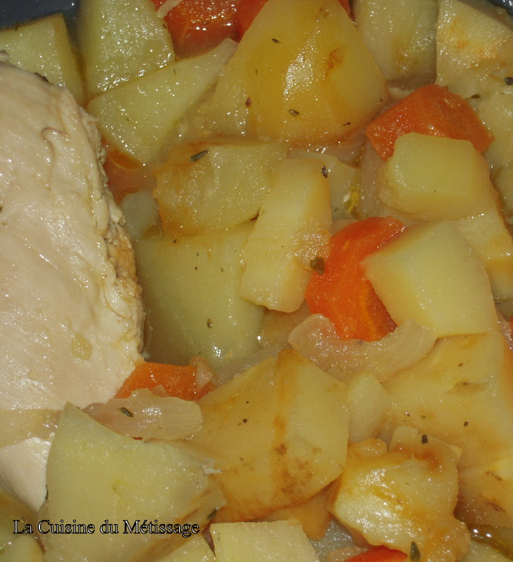 Ensuite, j’ai rajouté les carottes, les pommes de terre, le panais, le verre de vin blanc, le cube de bouillon, sel, poivre, thym et j’ai ajouté un peu d’eau.