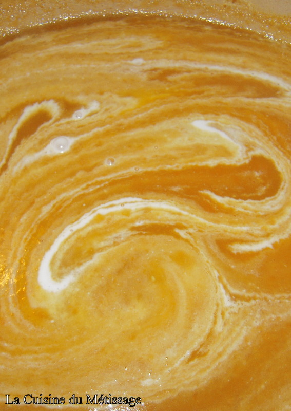 Au bout de 20 mn, j’ai mixé le tout, rajouté le cumin, le curry, le lait de coco, sel et poivre. Je l’ai laissé 5 mn de plus sur feu doux et voilà, c’est prêt.