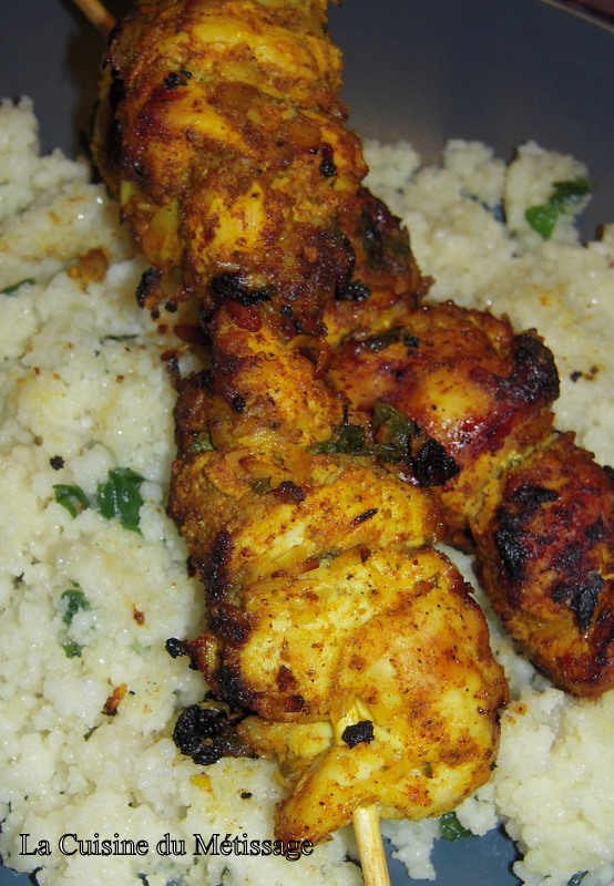 J’ai servi ces brochettes avec de la semoule dans laquelle j’ai rajouté du persil et de la menthe.