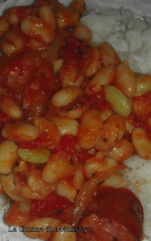 J’égoutte les mojettes et les saucisses, que je coupe en rondelles épaisses, et je verse le tout dans la cocotte. J’arrose avec le jus des tomates restants.