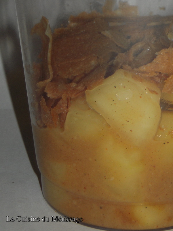 Je mets les pommes dans des verres et je parsème de crêpes dentelles écrasées.