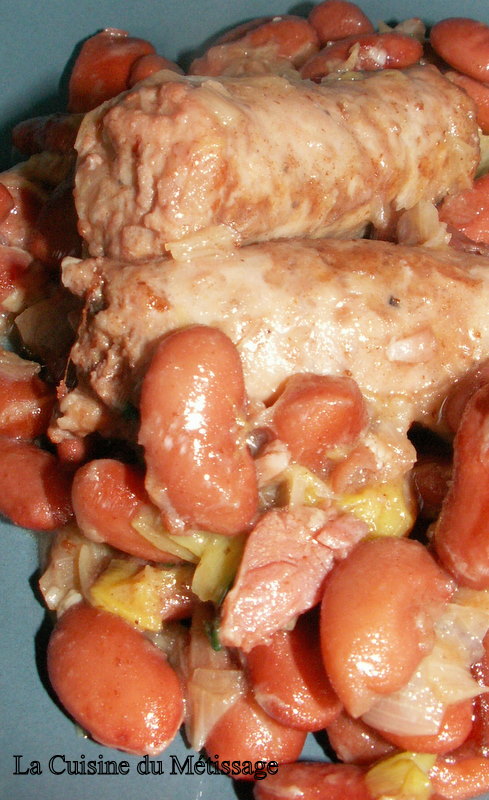 J’ajoute les haricots, le vin blanc, le bouillon Kub et 20 cl d’eau.