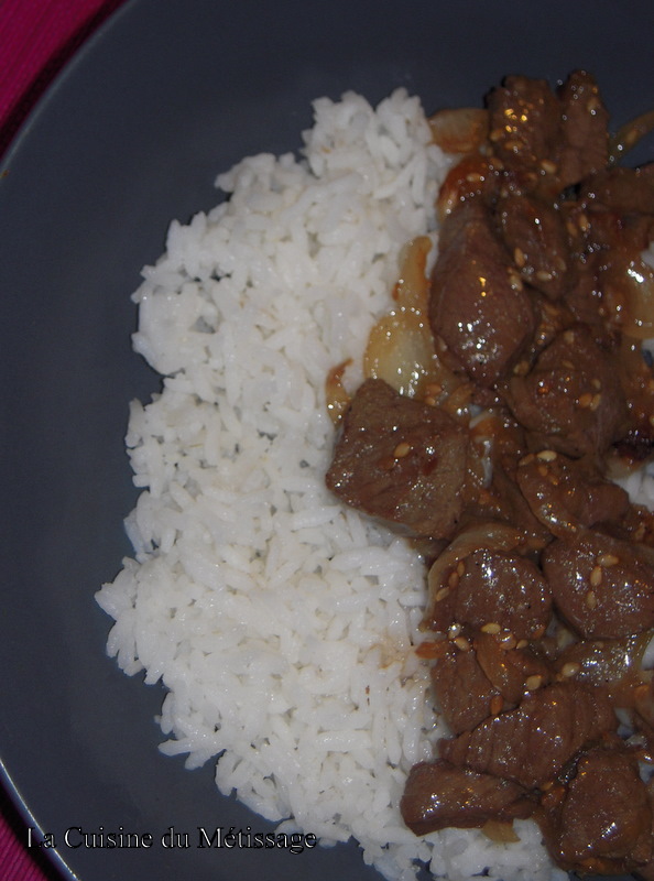 J’ai parsemé des graines de sésame sur le boeuf et je l’ai servi avec du riz.