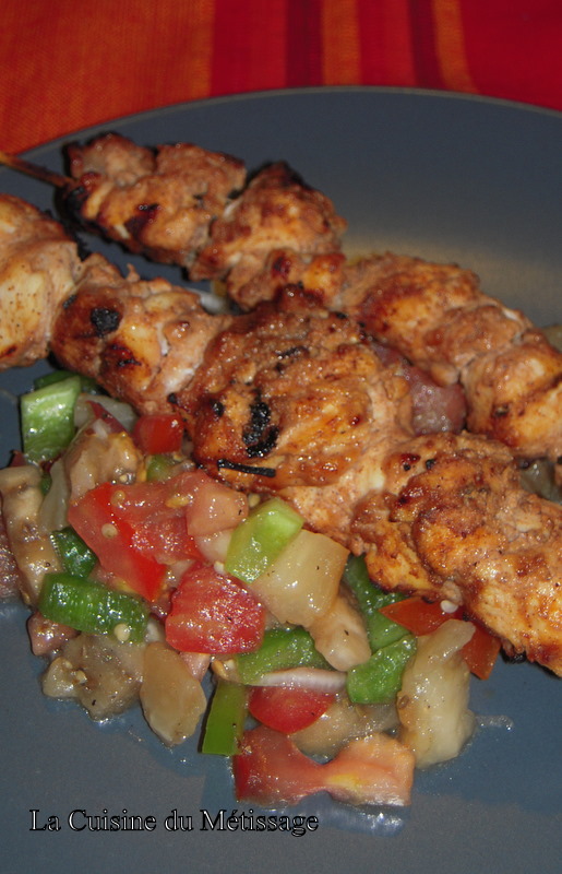 Pour ma part, j’ai servi ces brochettes avec une salade à base de dés d’aubergines grillées, poivron vert, tomates, oignons, jus de citron et huile d’olive.