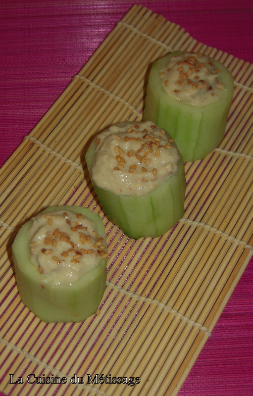 Ah tiens, bonne idée!! Habituellement, je fais ces petits "makis" de concombre, mais je les "fourre" d'oeufs de lump rouges..Ta recette me permettra de varier les plaisirs! Merci.