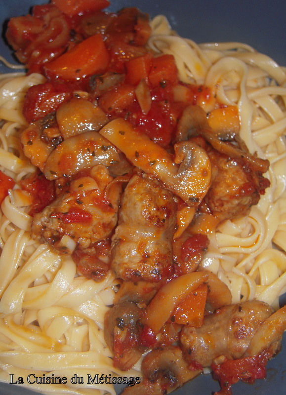 Une fois les fettuccine cuites, je répartis celles-ci dans les assiettes et verse de la sauce aux saucisses par-dessus.