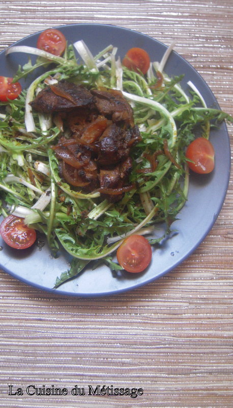 Je verse la sauce sur les foies de volaille et je dresse ceux-ci sur les pissenlits.