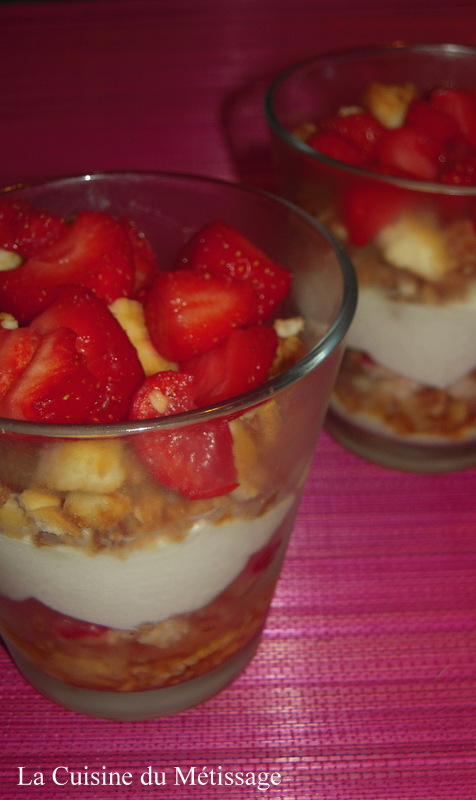 Dans des verrines : alterner des couches de fruits, de crème et de biscuits en commençant par la crème et en terminant par les fruits.