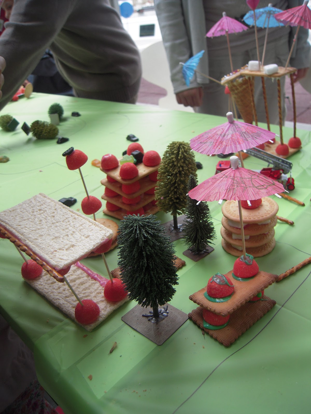 Tout d’abord, les 2 animatrices ont expliqué aux enfants comment se construisait une ville. Puis ensuite, ont expliqué qu’on pouvait repenser bâtiments, immeubles et espaces autrement, c’est à dire avec des matériaux originaux comme des bonbons ou gâteaux.
