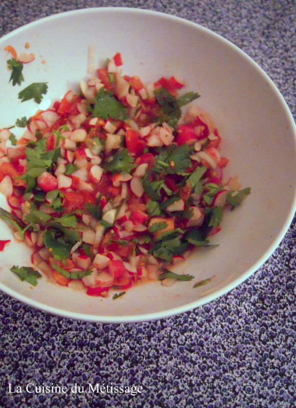 Pour info, cette salade porte le nom de « Mooli Chi Koshimbir »; en Marathi (la langue parlée au Maharastra, dont la capitale est Bombay), koshimbir signifie « salade ». En Inde, les salades ne sont pas accompagnées de vinaigrette. Cette salade est simplement arrosée de jus de citron et de sel, les notes principales émanant du piment et de la coriandre. (source : Cuisine Indienne de Manju Malhi – Hachette Cuisine).