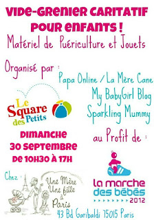 Aussi, je relaie la belle initiative lancée par 5 blogueurs engagés : Papa Online !Mère CaneSparkling Mummy et My Baby Girl Blog qui se mobilisent et organisent un vide grenier caritatif au profit de La Marche des Bébés, le 30 septembre 2012.