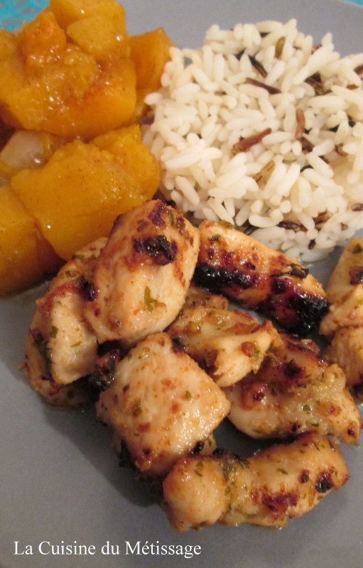 J’ai accompagné le poulet d’un sauté de potiron aux cinq épices chinoises et d’un riz sauvage.